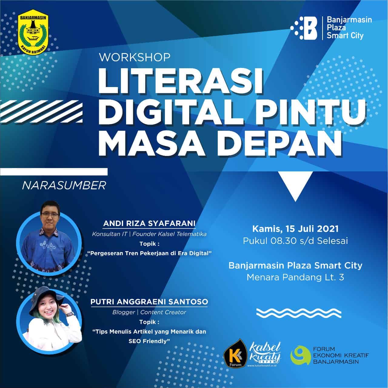 Ikuti Workshop Literasi Digital Pintu Masa Depan yang diselenggarakan di Banjarmasin Plaza SmartCity, hari Kamis, tanggal 15 Juli 2021.