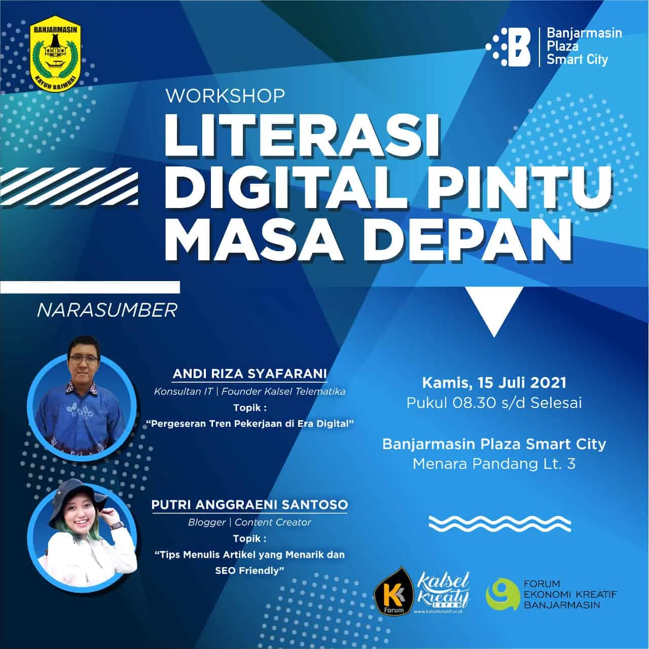 Ikuti Workshop Literasi Digital Pintu Masa Depan yang diselenggarakan di Banjarmasin Plaza SmartCity, hari Kamis, tanggal 15 Juli 2021.